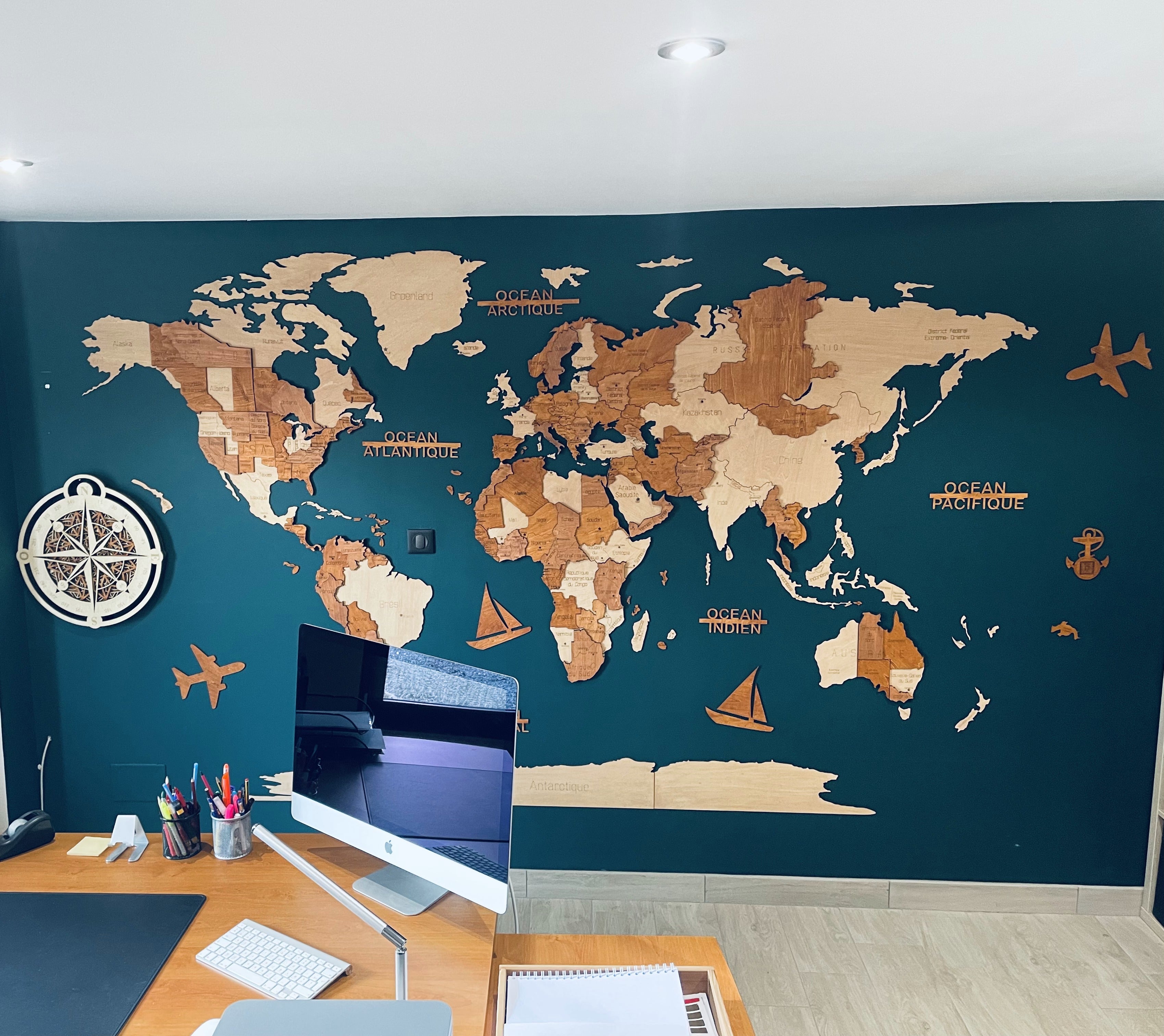Carte du monde murale 3D en bois – gravure ultra-détaillée, fabrication française