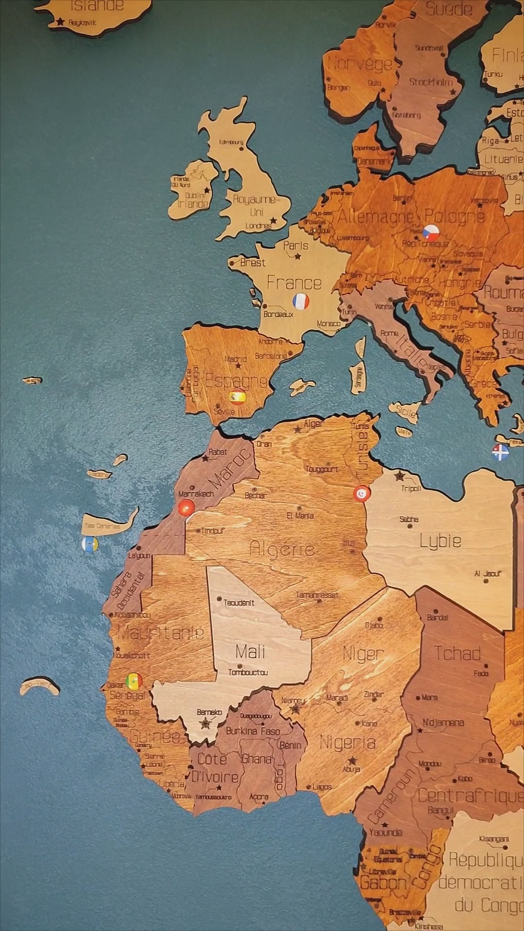 Carte du Monde en Bois 3D — Gravée en français, pensée pour votre intérieur